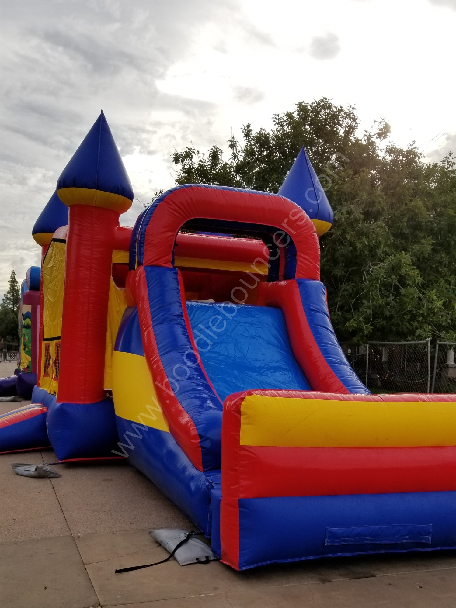 Our bright colored, Castle Combo will be sure to catch the attention of your guests. Your guests will enjoy bounce time in our 13x13 bounce house with basketball hoop. When they are ready to exit the bounce area, they will climb the ladder and proceed down the slide.