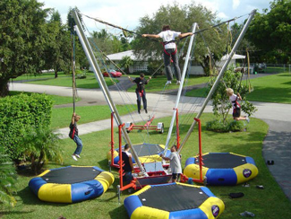 One to four jump stations available depending on your needs and budget. Each jump station is manned by a trained staff person. Lifting hoist and bungee cords help the jumper reach new heights in a controlled environment. Bungee and hoist systems allow the jumper to perform front or back flips safely.