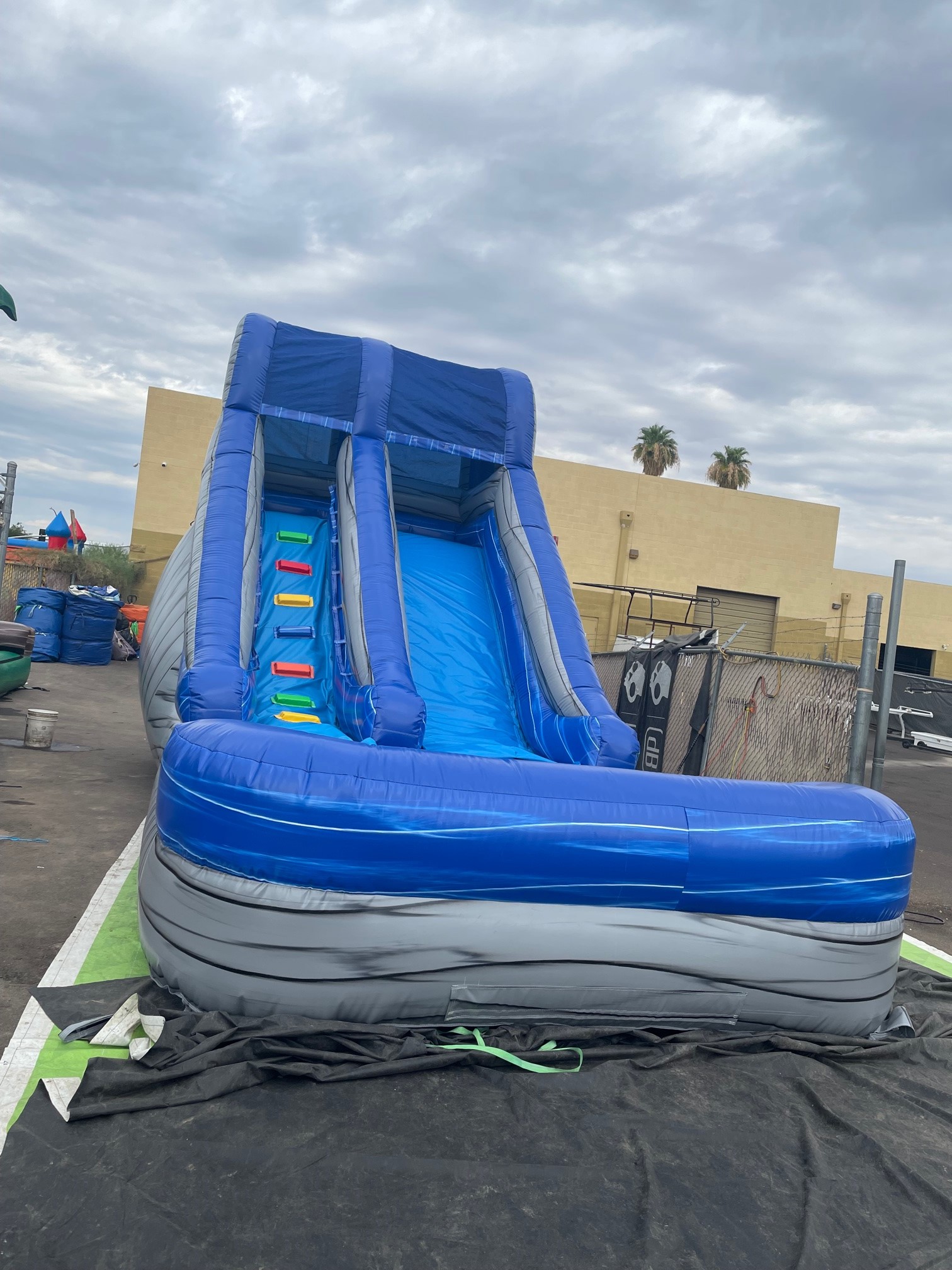 Take a break from the heat with this 16 Foot Ocean Waterslide. The blue and grey colors will draw in for some refreshing fun. Climb up the stairs and slide down the slide into a pool of water. Your guests do not need to exit the unit to climb up the ladder to continue having fun. Great fun for all ages.
