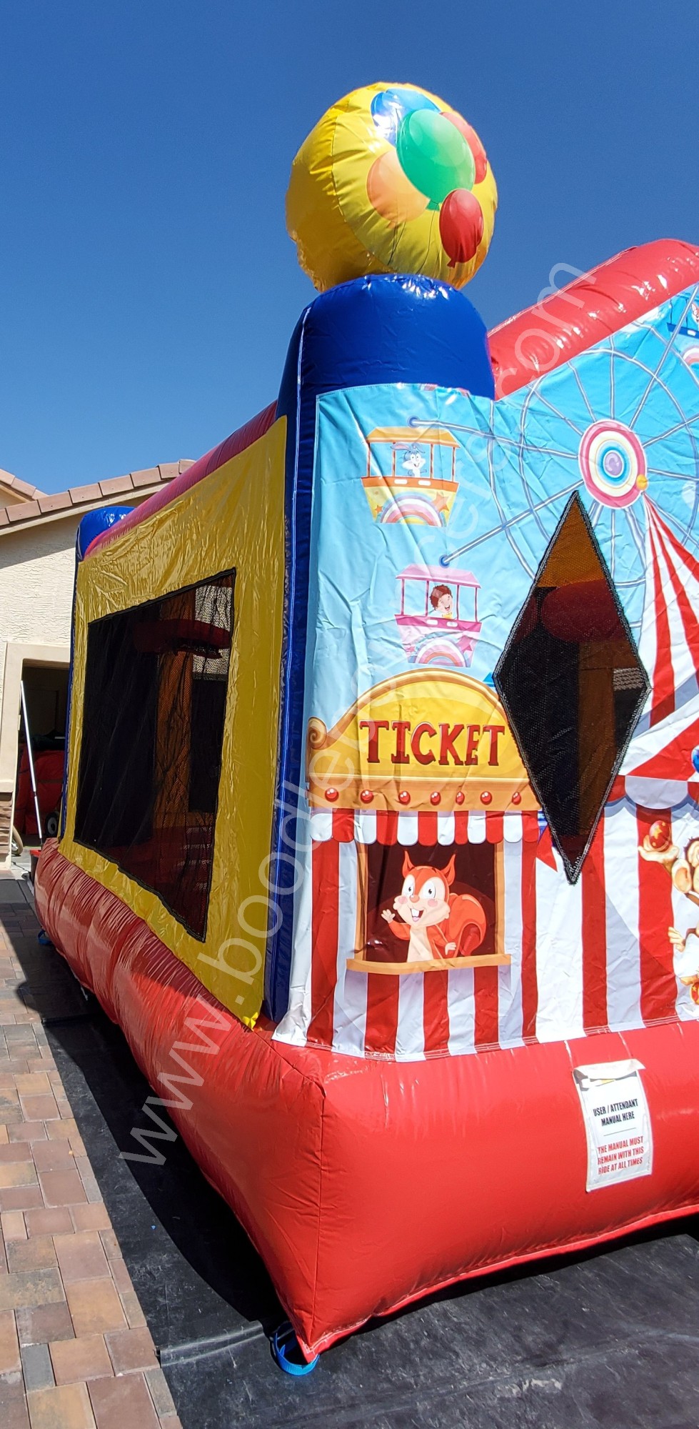 Get excited! The carnival is here. It's time to celebrate and have hours of fun with friends and family in this Carnival bounce house. All ages are welcome to join. Enter through the tent to start fun and excitement. This 15'x15' unit includes a hoop (ball not provided). Do not miss the carnival and the circus. It puts a smile and all faces.